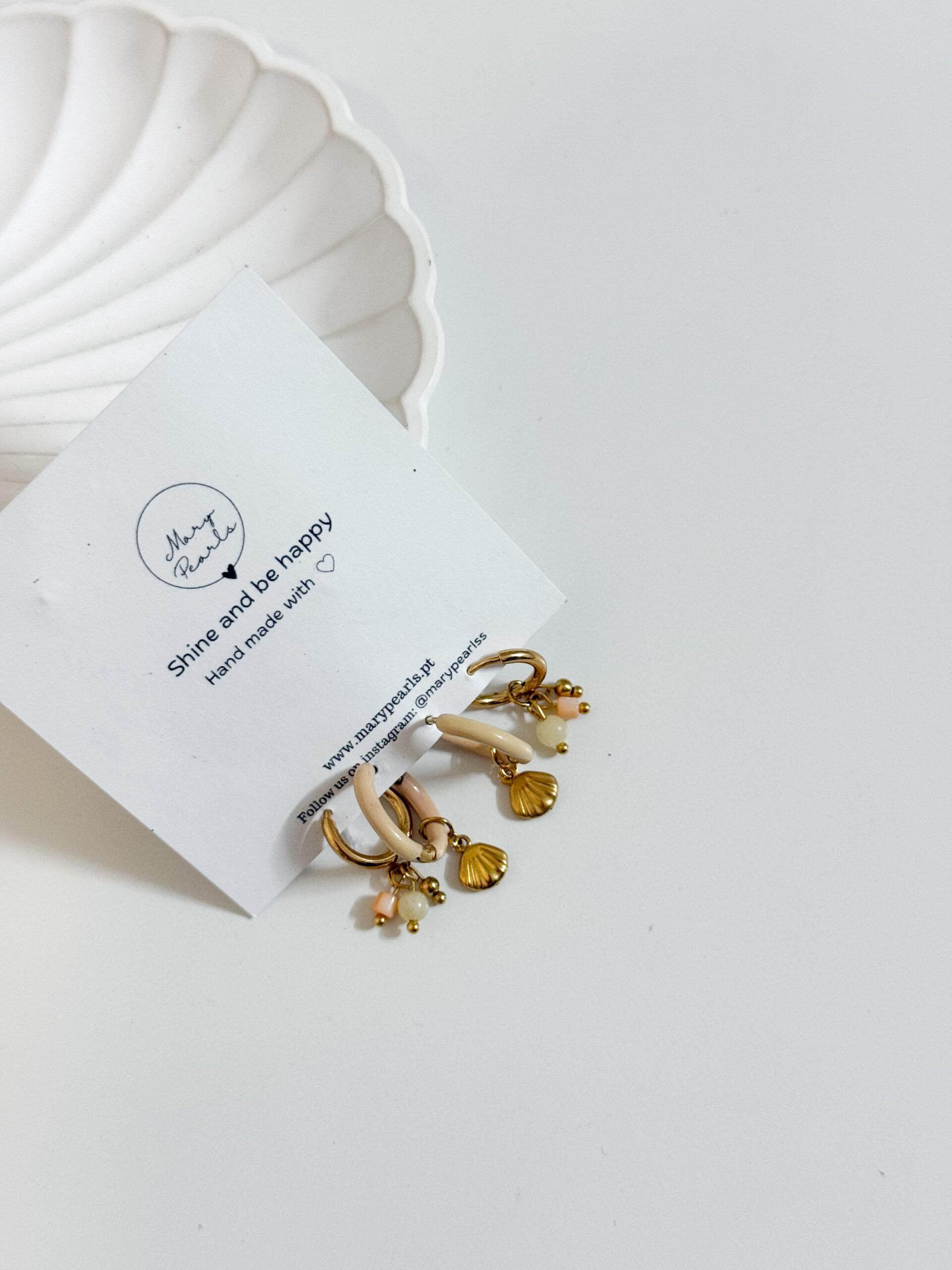 Conjunto de argolas brancas com conchas vieira douradas e pérolas.