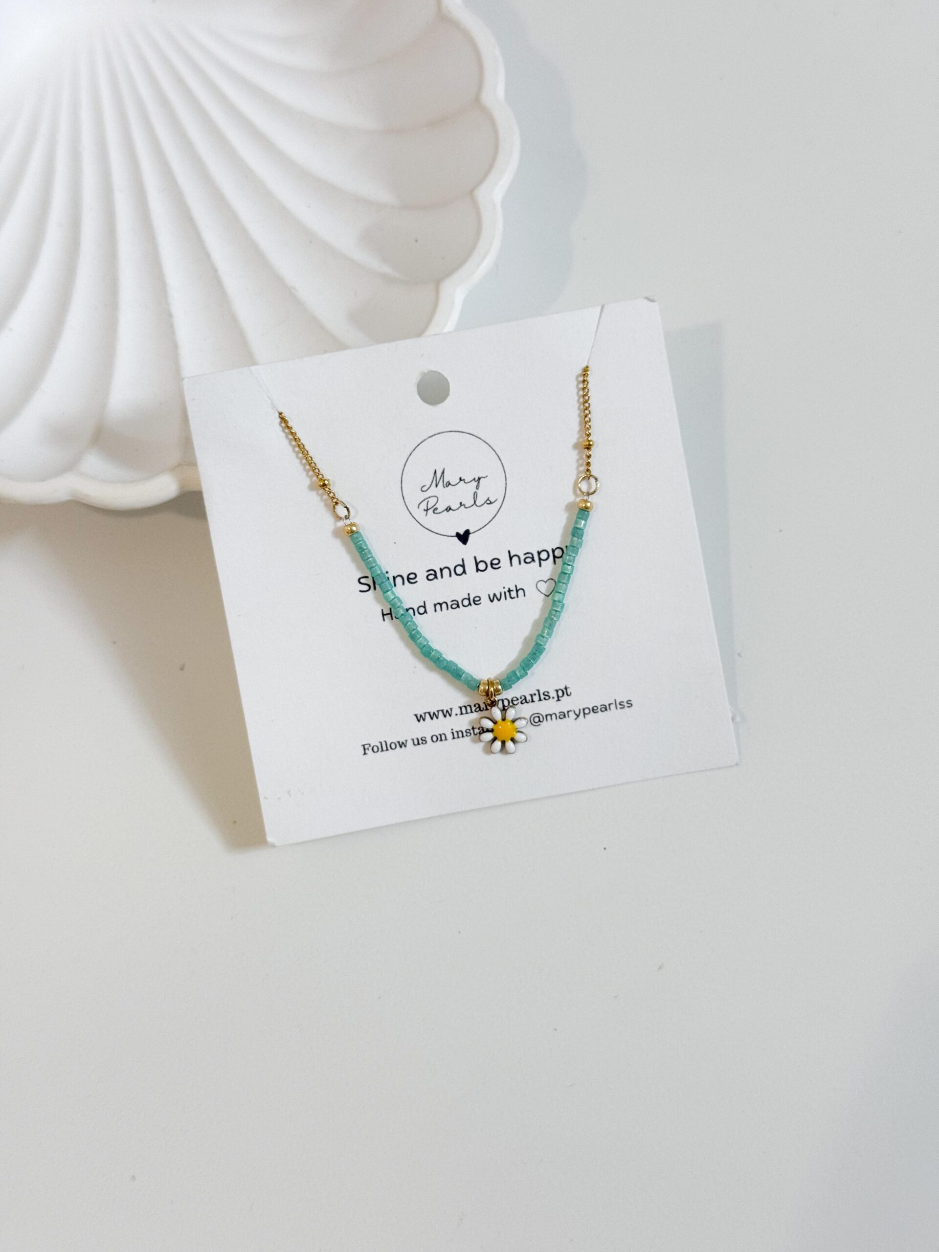 Pulseira com contas verdes e pendente margarida esmaltada.