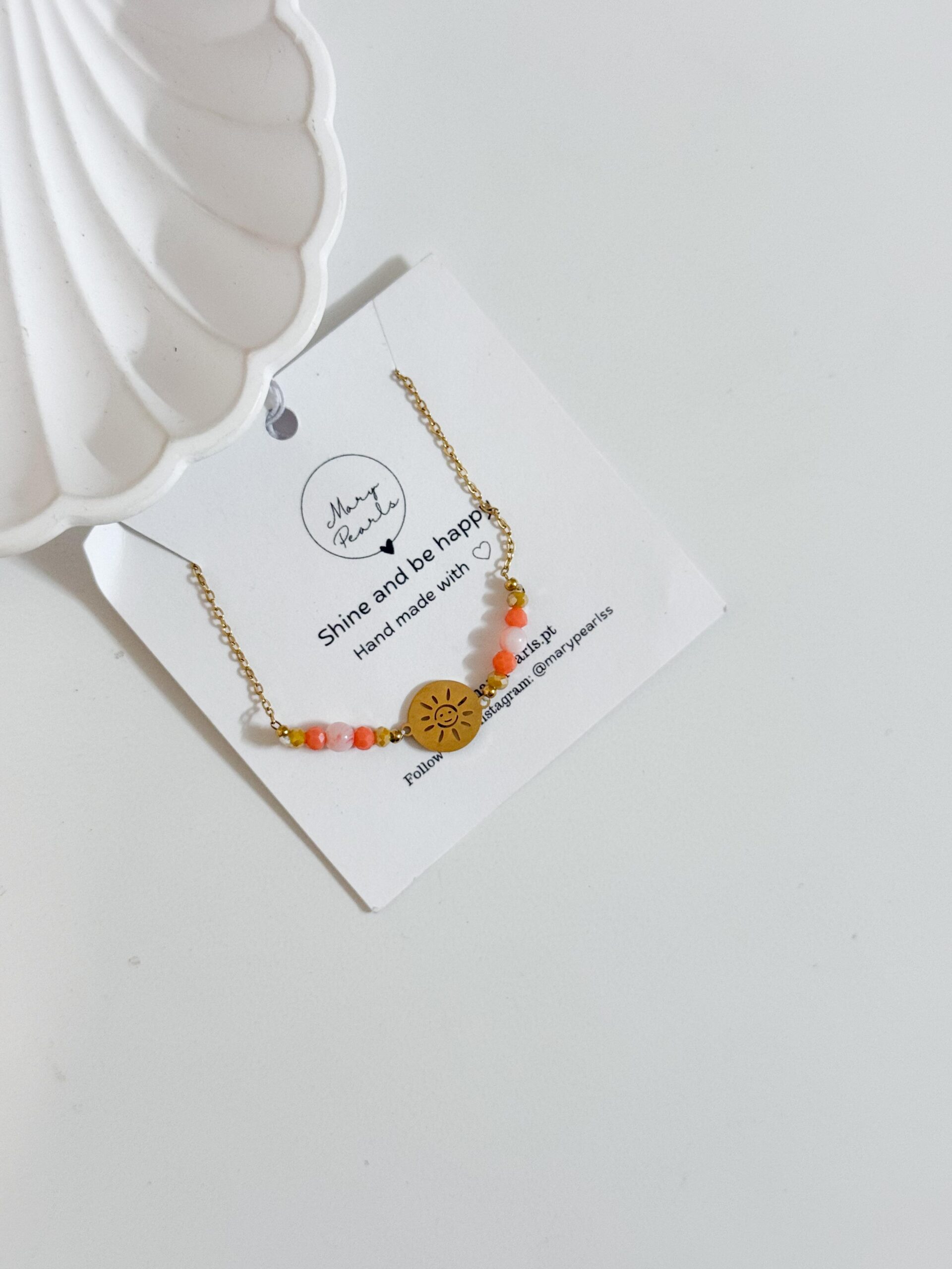 Pulseira com contas pêssego e medalha de sol ao centro.